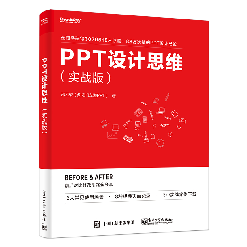 这本书只讲了必知必会的PPT设计常识:三个PPT设计思维,一个视觉风格公式,四个PPT排版的办法。这本书采用Before-After 的形式,来把 PPT 修改的过程写出来,不仅分析原稿所存在的问题,而且,会有针对性地提出解决方案,并附上基于修改思路处理后的PPT页面。这本书不讲大道理,只讲设计优化的实践,给出思路,让设计落地。这本书可以让你少走弯路,真正搞定PPT。